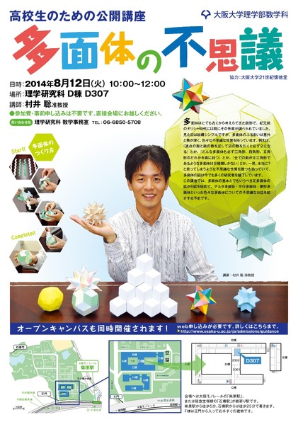 大阪大学理学部数学教室では、数学に興味を持つ若い皆さんのために、現代数学の様相と数学研究の実際、自然科学や社会科学に及ぼす数学の影響、文化としての数学の在り方などについて、多角的な視点から易しく解説する公開講座を以下の要領で開催します。受講料は無料で、事前申し込みも不要です。