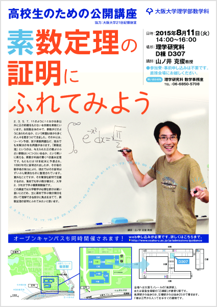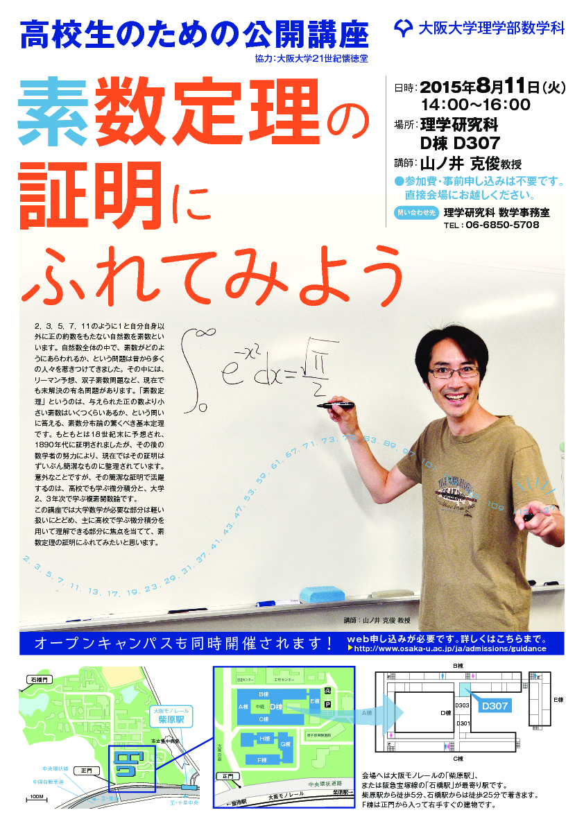 大阪大学理学部数学教室では、数学に興味を持つ若い皆さんのために、現代数学の様相と数学研究の実際、自然科学や社会科学に及ぼす数学の影響、文化としての数学の在り方などについて、多角的な視点から易しく解説する公開講座を以下の要領で開催します。受講料は無料で、事前申し込みも不要です。