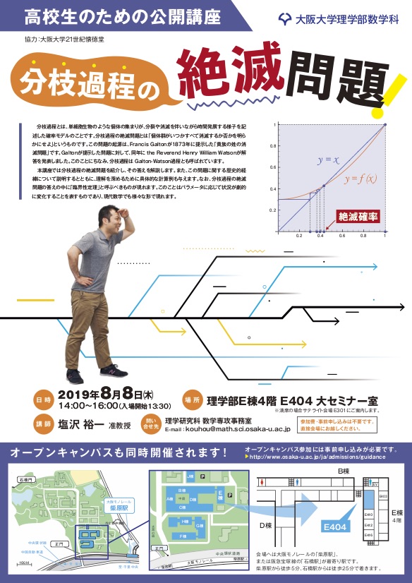 大阪大学理学部数学教室では、数学に興味を持つ若い皆さんのために、現代数学の様相と数学研究の実際、自然科学や社会科学に及ぼす数学の影響、文化としての数学の在り方などについて、多角的な視点から易しく解説する公開講座を以下の要領で開催します。受講料は無料で、事前申し込みも不要です。