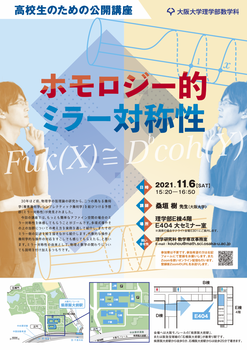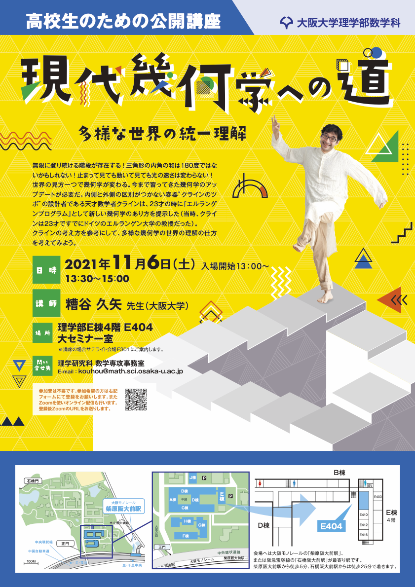 大阪大学理学部数学教室では、数学に興味を持つ若い皆さんのために、現代数学の様相と数学研究の実際、自然科学や社会科学に及ぼす数学の影響、文化としての数学の在り方などについて、多角的な視点から易しく解説する公開講座を以下の要領で開催します。