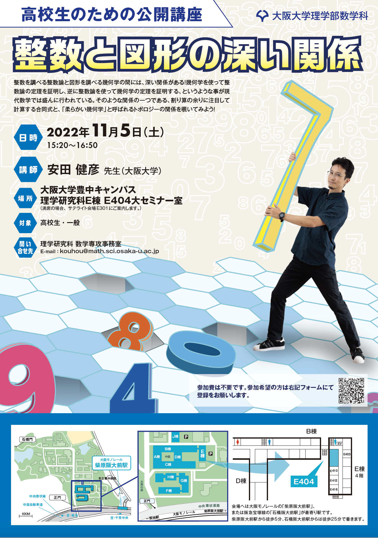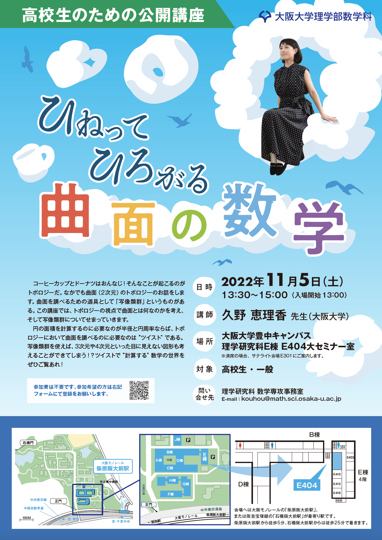 大阪大学理学部数学教室では、数学に興味を持つ若い皆さんのために、現代数学の様相と数学研究の実際、自然科学や社会科学に及ぼす数学の影響、文化としての数学の在り方などについて、多角的な視点から易しく解説する公開講座を以下の要領で開催します。