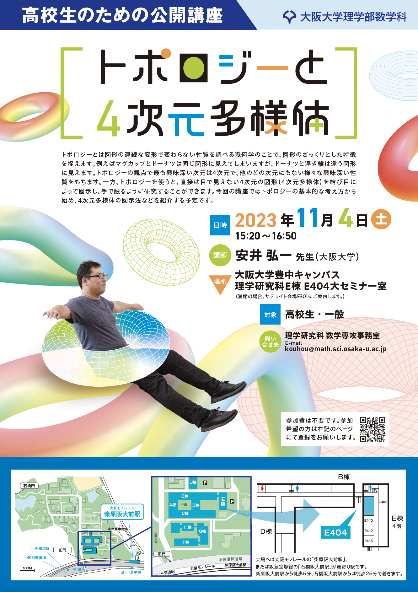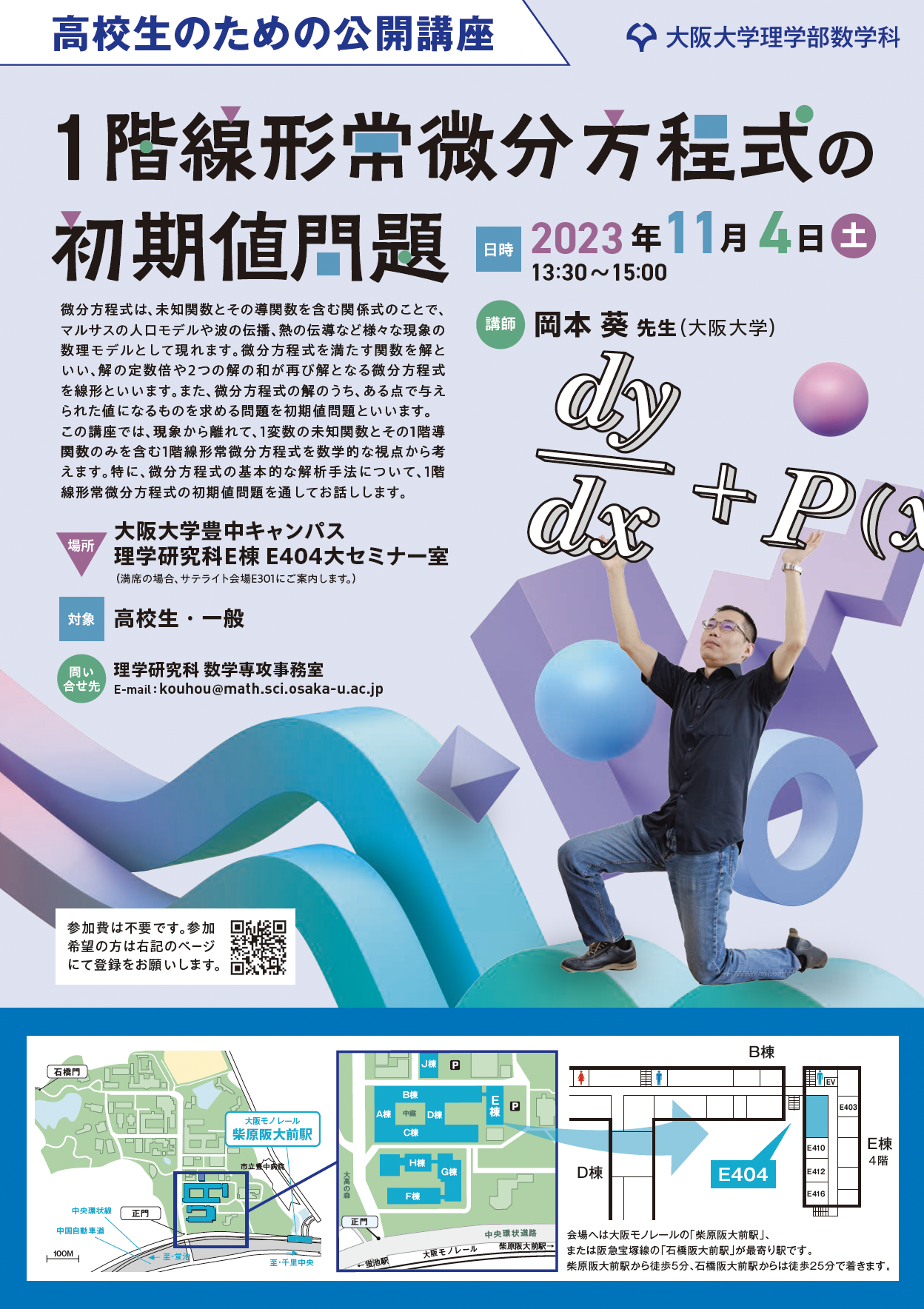 大阪大学理学部数学教室では、数学に興味を持つ若い皆さんのために、現代数学の様相と数学研究の実際、自然科学や社会科学に及ぼす数学の影響、文化としての数学の在り方などについて、多角的な視点から易しく解説する公開講座を以下の要領で開催します。
